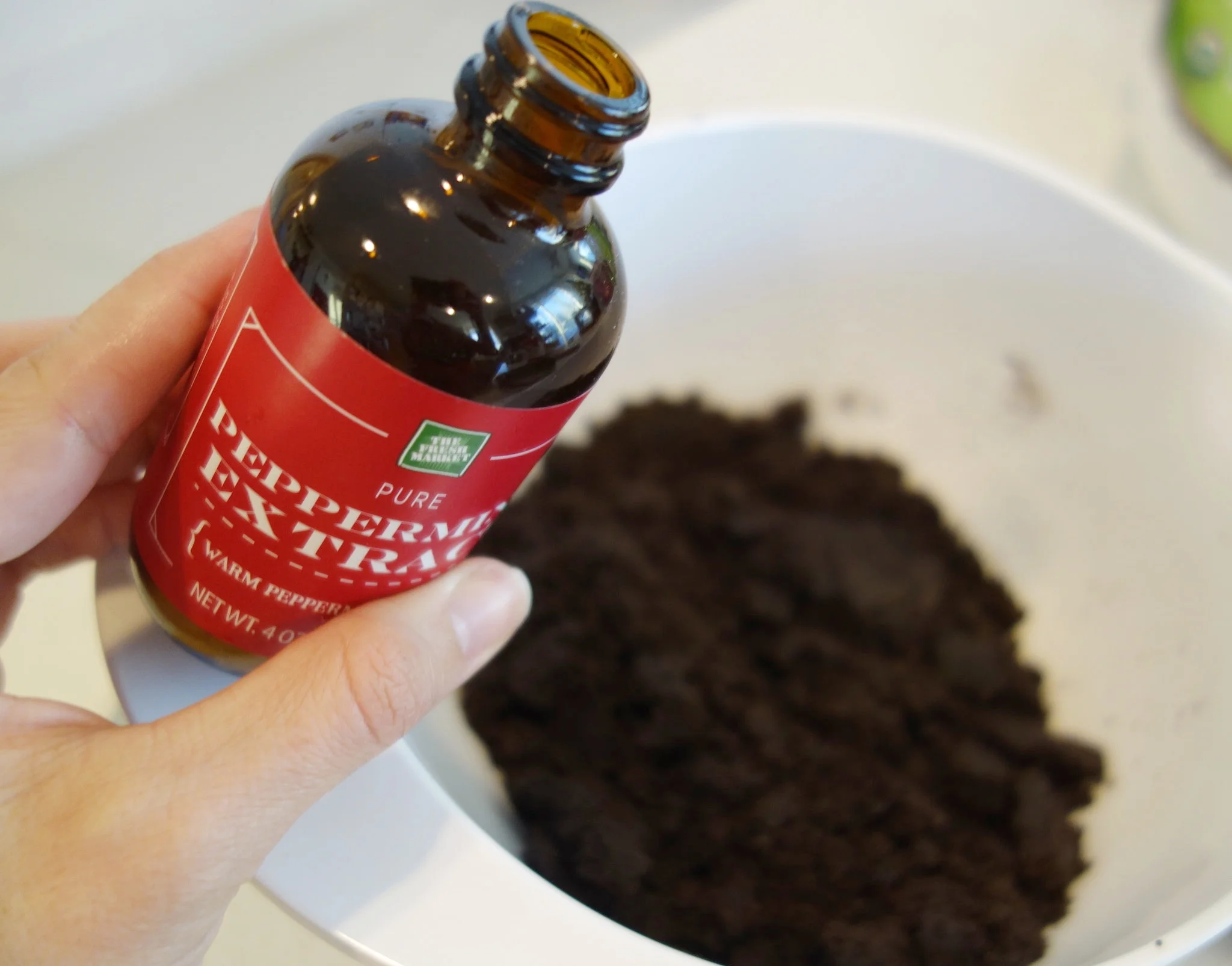 Add your secret holiday ingredient, peppermint extract, and stir in with a spoon. Notwithstanding the photo below, make sure you measure this ingredient with precision; the crust will thus have the amount of mint that makes you think of chestnuts roasting on an open fire, not the kind that makes you think of oral hygiene.