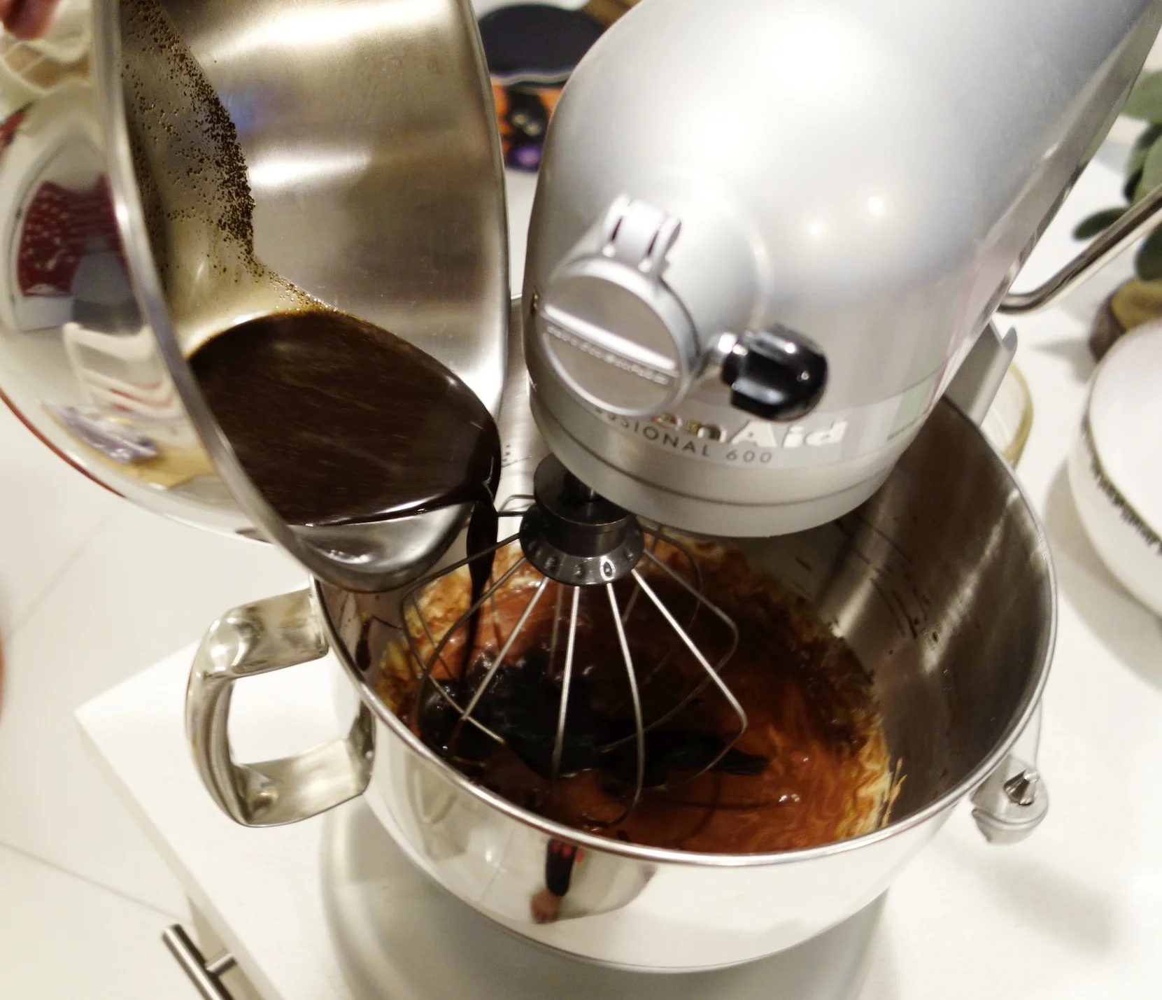 Add the chocolate mixture and beat until just combined. Reduce the speed to low, add the coffee mixture, and, again, beat until just combined.