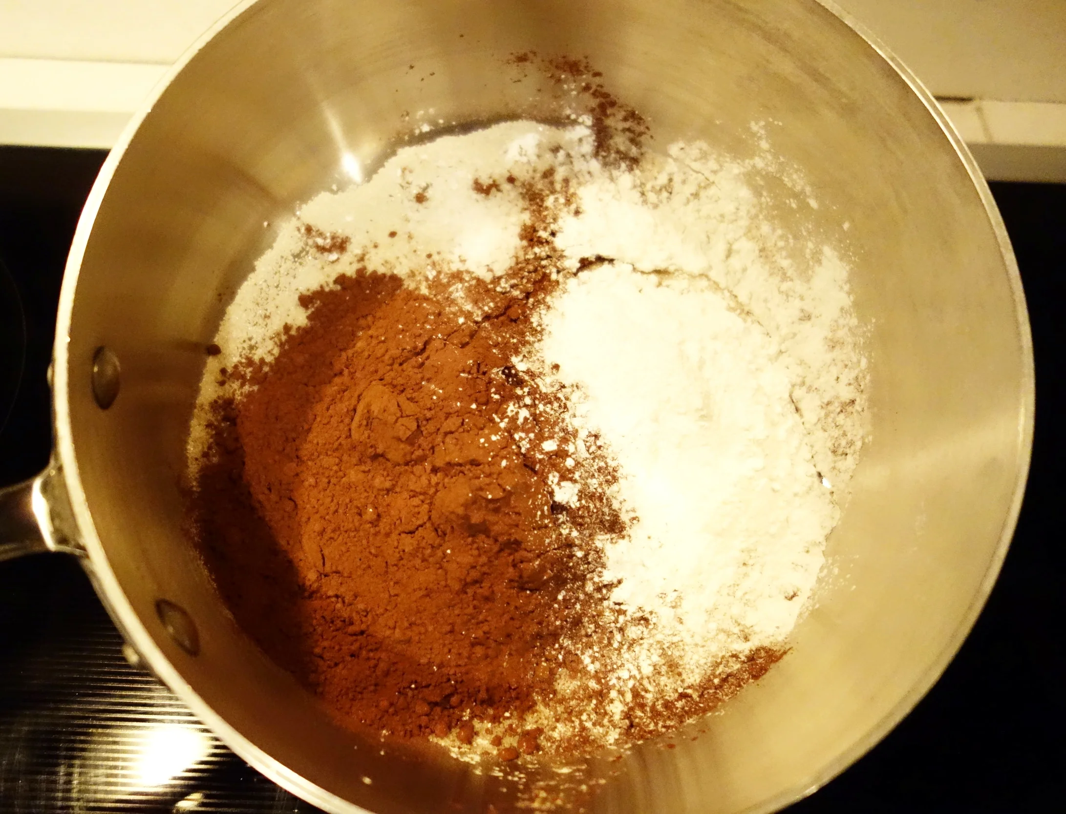 In a saucepan, whisk together the sugar, cocoa, cornstarch, and salt.